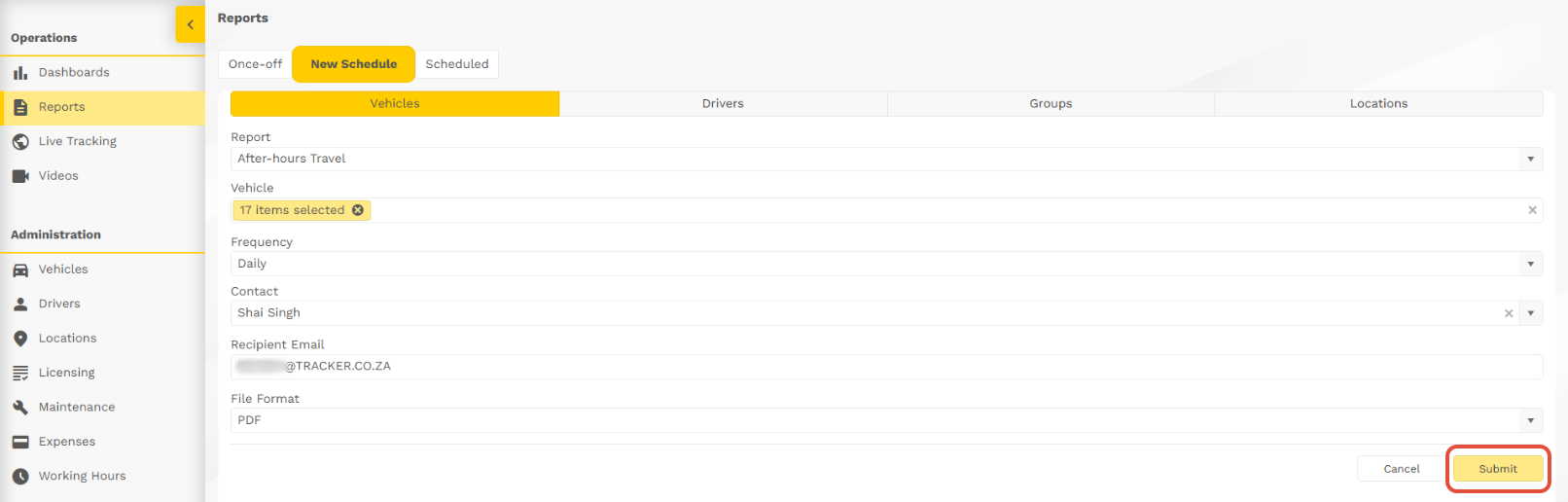 This tab is used for scheduling new reports that must be sent to a specific user being daily, weekly, weekday, or monthly.