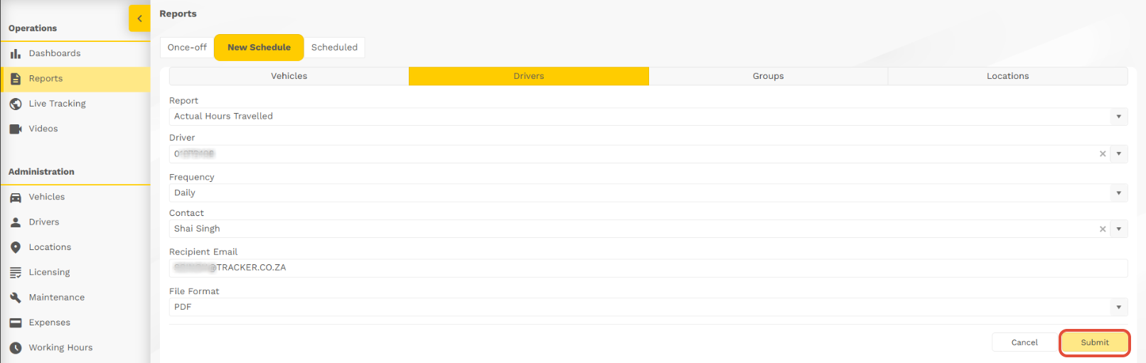 File format: Select whether the report must be sent as a PDF, XLS Doc or CSV format