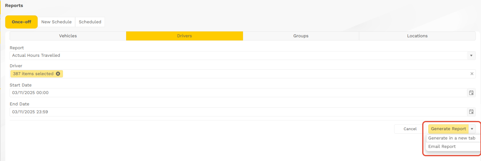 Generate Single Report: The Generate Single Report includes all the vehicles in to a single report rather than viewing them separately