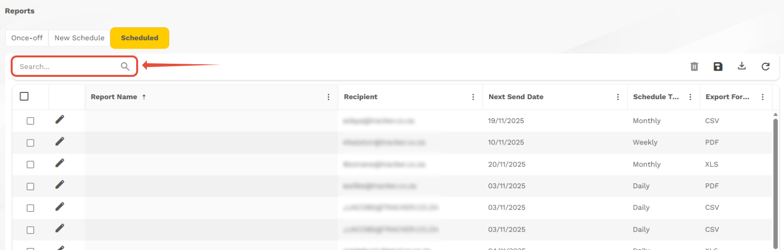 User can view, search, delete, save, export users that have been already loaded for scheduled reports.