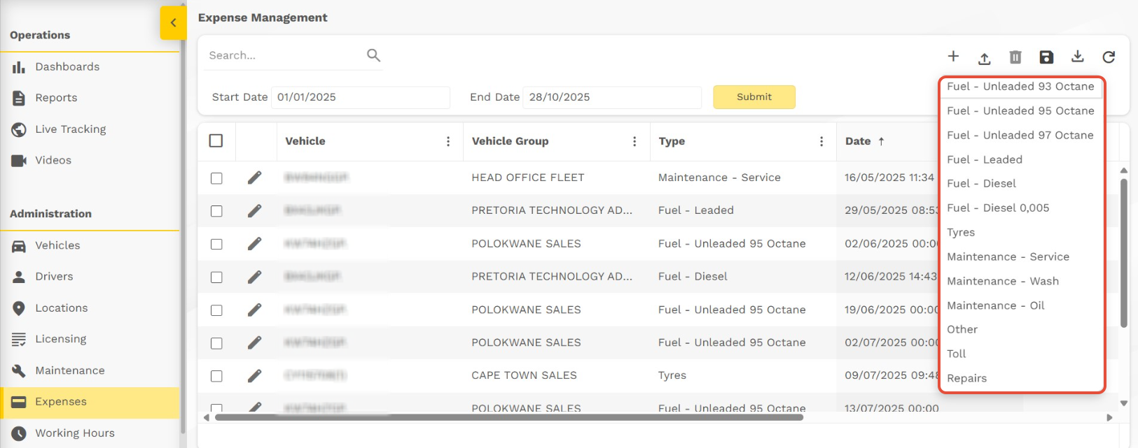 - Select the type of Expense you want to load (Fuel, Tyres, Maintenance Service, Maintenance wash, Maintenance oil, Other, Toll, Repairs)