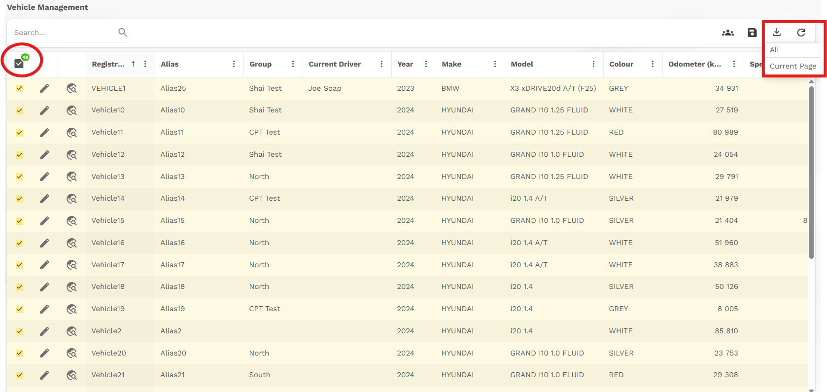 - Select the vehicle/s you want exported to an excel spreadsheet