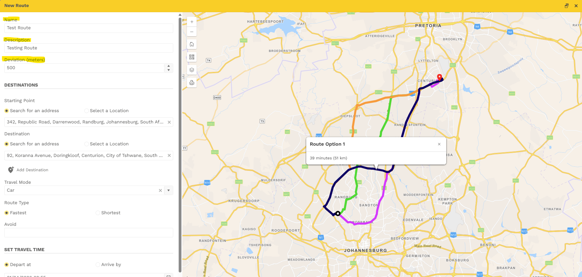 - Select the Route Type (Fastest/Shortest)